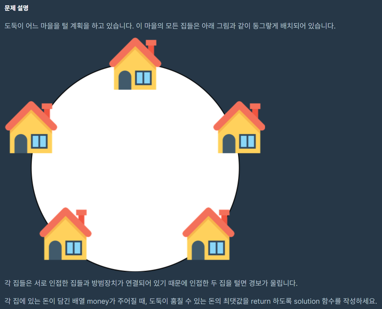 dp[0]과 dp[1]을 money[0]으로 넣은 이유는 dp는 첫번째 집을 도둑질 했을 때의 가정이고 dp[0] (첫번째 집을 도둑질 했을 때 최적해 => 첫번째 집의 돈) dp[1] (첫번째 집을 도둑질 했기 때문에 2번째 집을 도둑질 할 수 없어서 여전히 첫번째 집의 돈이 최적해)